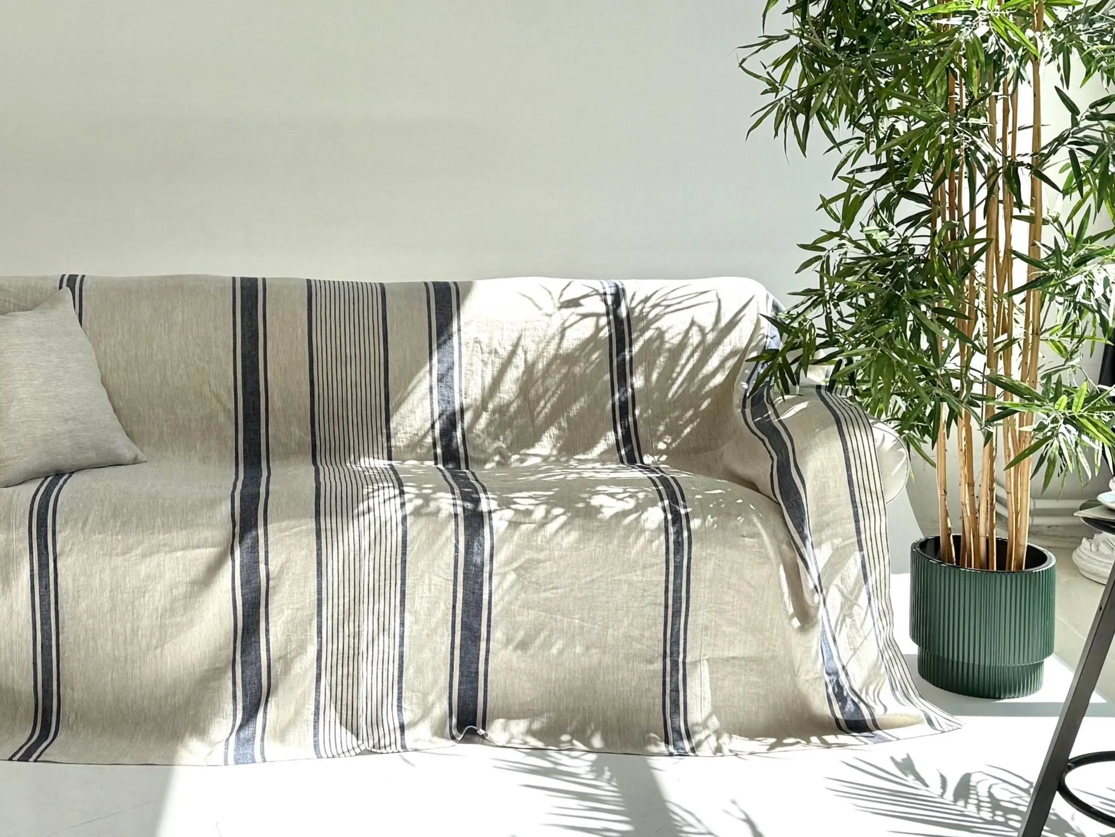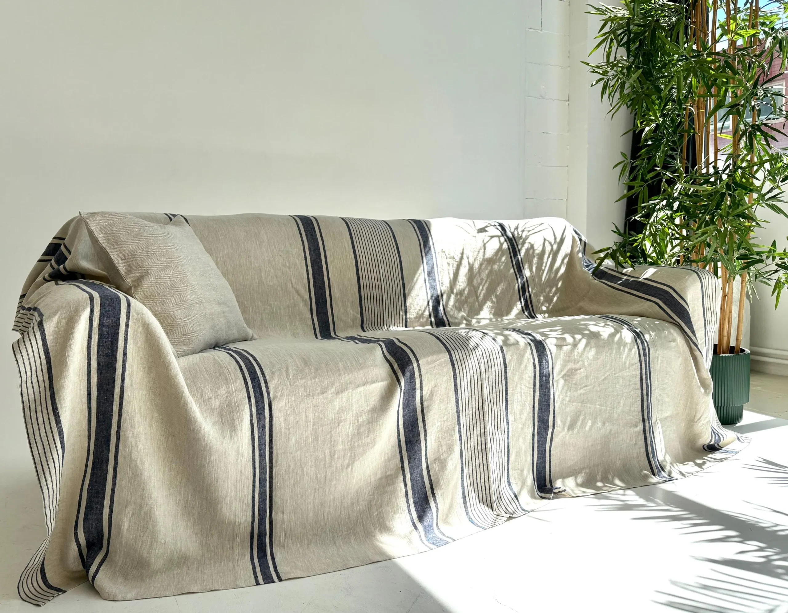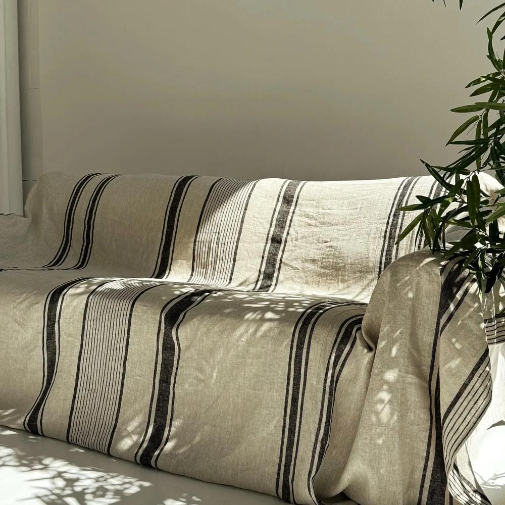 Handmade from 100% heavyweight European linen (260 g/m²), this rustic couch cover features a natural beige color with classic blue stripes. Designed in a French farmhouse style, it’s perfect for protecting your sofa while adding a touch of vintage charm. The stonewashed linen ensures softness and durability, making it ideal for everyday use.