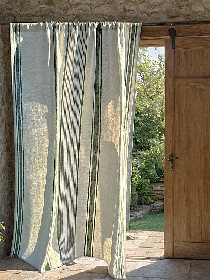 These farmhouse linen curtains are made from 100% natural European flax with a classic green stripe.