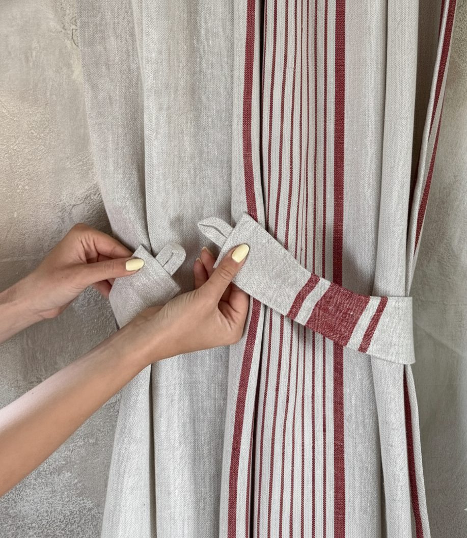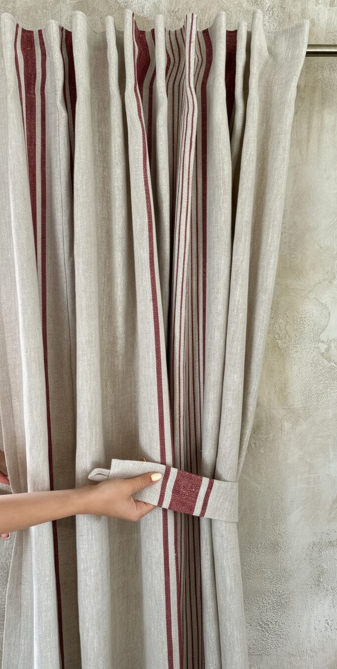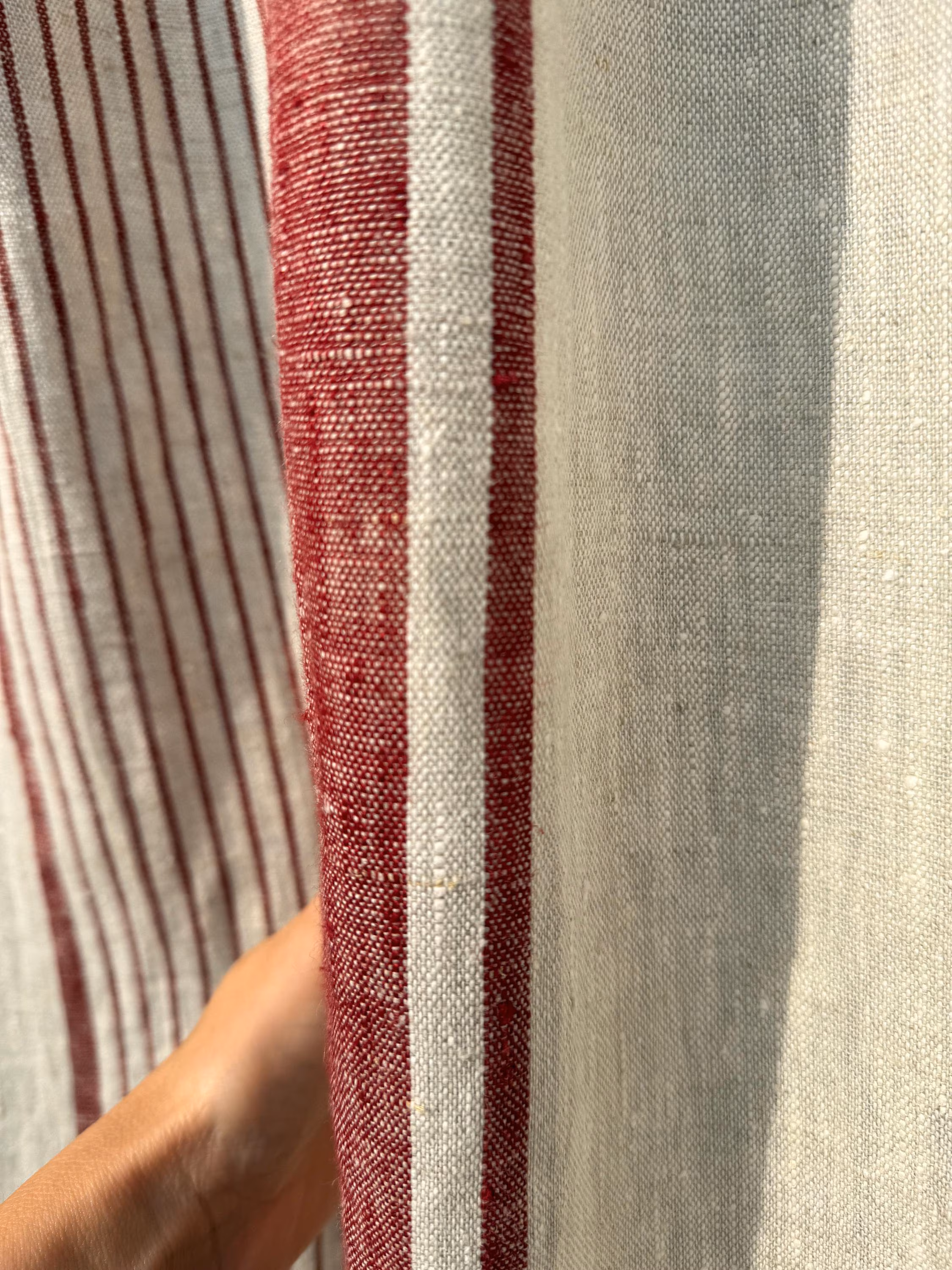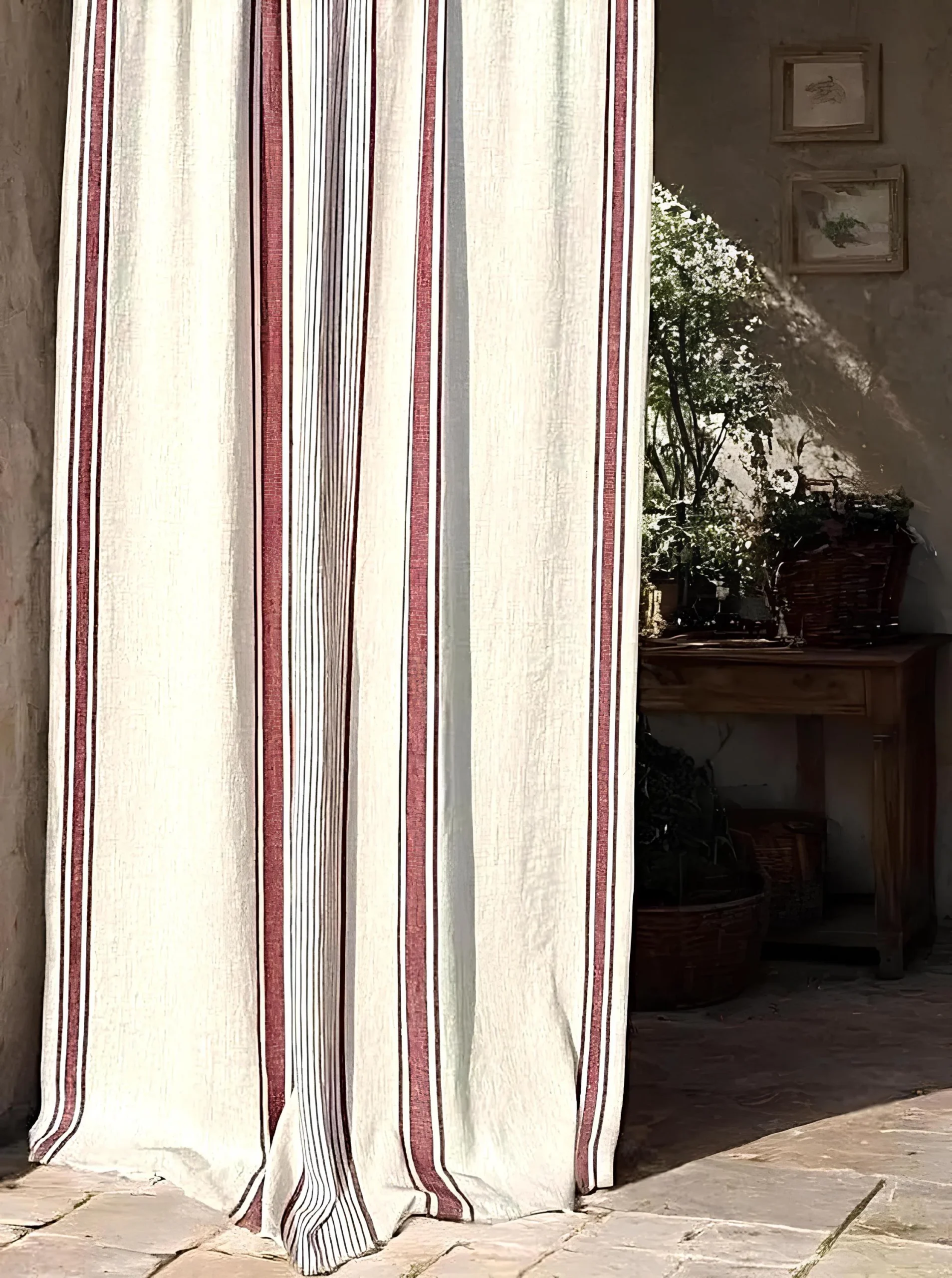 Red striped French country linen drapes sewn from heavy linen fabric 270 gsm. The sturdy weave gives these natural linen curtain panels a soft weight that falls beautifully, while the red stripes bring a touch of farmhouse warmth. Designed with a simple rod pocket top, they work as rustic country curtains in a cottage living room or as linen doorway drapery for a cozy farmhouse feel. If you need custom sizes for these curtains, we are happy to make them for you. Please contact us at info@hugmelinen.com with your measurements and quantity.