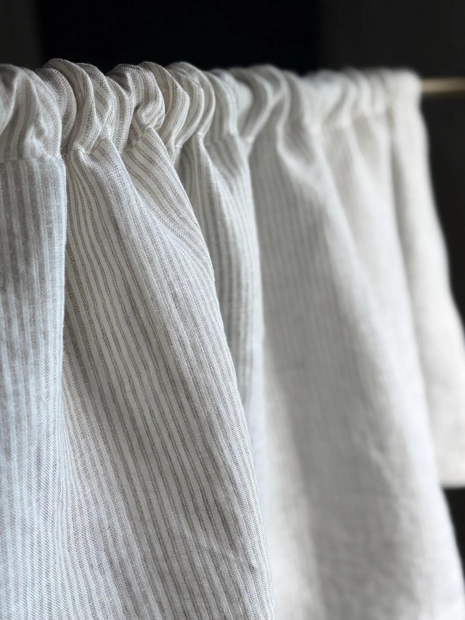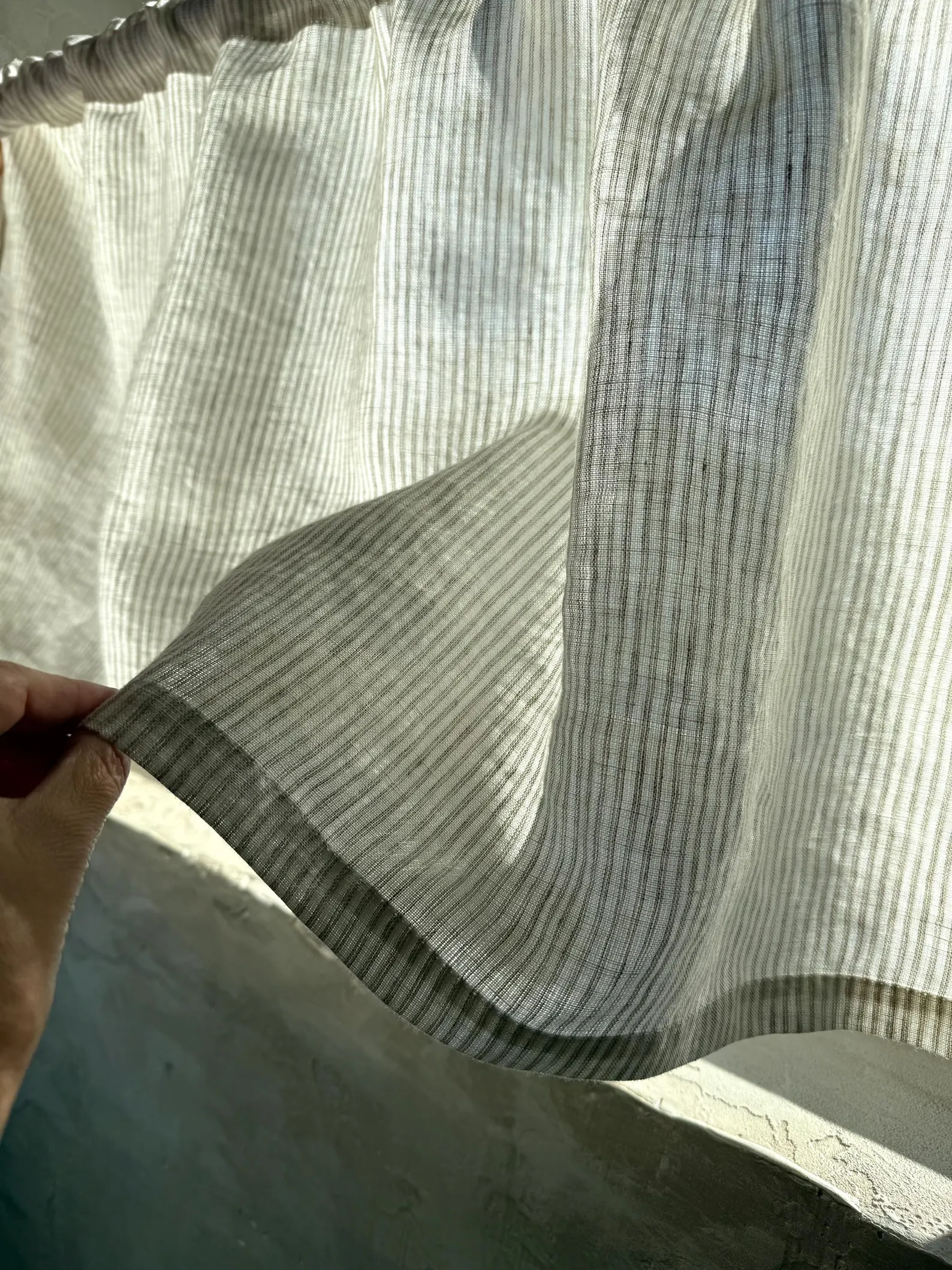 This striped linen cafe curtain is handmade from 100% softened European flax linen in a natural fine-stripe pattern. The midweight fabric of 185 g/m² (≈ 5.5 oz/yd²) has the right density for everyday use – durable, yet airy enough to filter light beautifully while providing privacy.